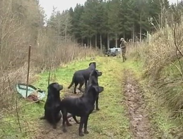 Well-trained black Labrador Retrievers patiently waiting for handling cues during a gun dog training session. These British Labradors demonstrate steadiness, focus, and teamwork — essential skills for working dogs in hunting and field trial environments. Proper steadiness training ensures that retrievers remain calm and ready for direction, whether in the field or during advanced search and rescue work.
