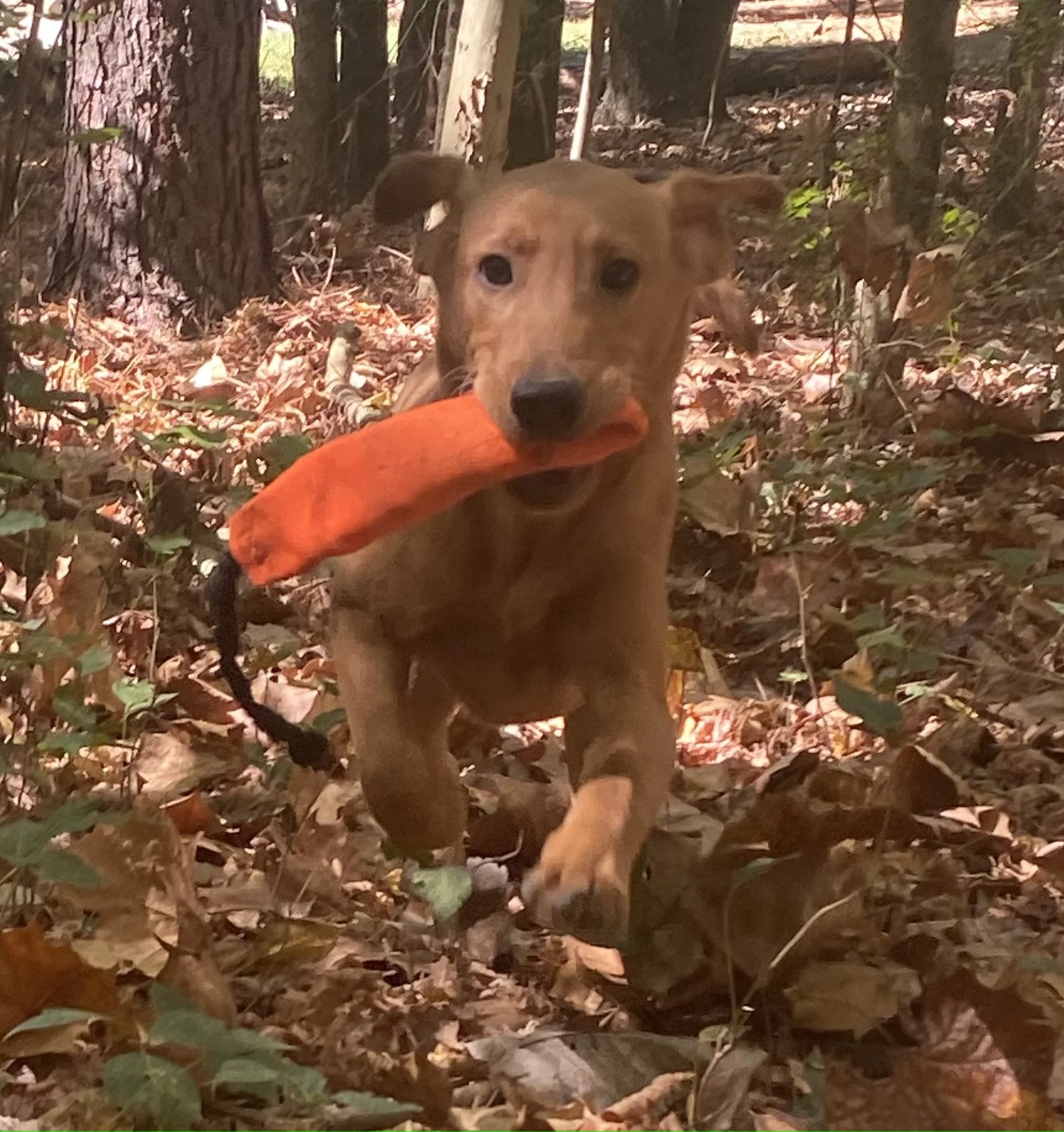 Fox red British Labrador Retriever puppy confidently retrieving a training bumper through the woods. This young gun dog in training is developing strong natural retrieving instincts, focus, and drive — essential qualities for future field work, hunting, and search and rescue training. Early retrieval exercises like this build a solid foundation for advanced handling and working dog success.