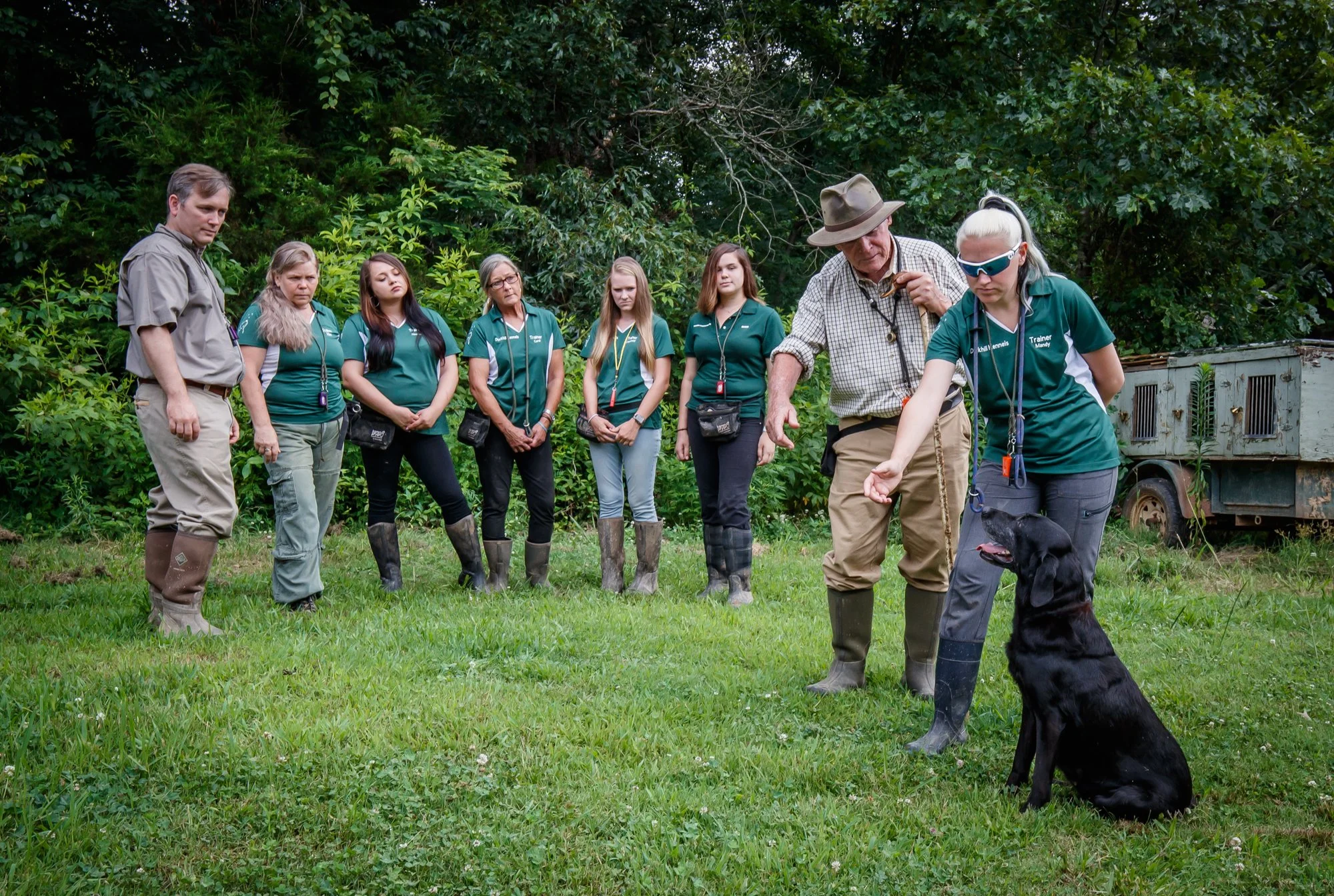 Robert Milner was deeply committed to passing on his knowledge, experience, and philosophy to the next generation of trainers. Through hands-on instruction and clear, positive methods, he shared not only the techniques of effective retriever training but also the values of patience, teamwork, and respect for the dog. His teaching emphasized clear communication, calm leadership, and a deep understanding of canine behavior, principles that continue to shape the training approach at Duckhill Kennels today. This photo captures Robert working closely with his training team, exemplifying his lifelong dedication to education and the advancement of positive, proven training methods.